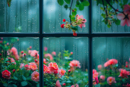 A window with raindrops on it and a view of a garden with red flowers. Scene is peaceful and calming