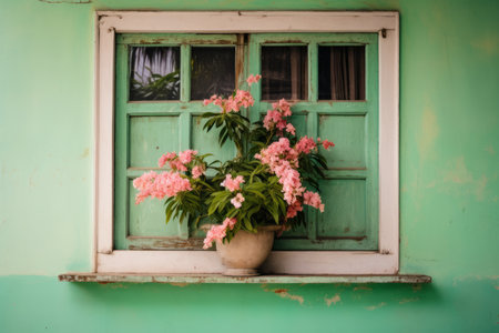 Blooming Harmony: A Green and Pink Flower Enchants a Green and White Wooden Framed Window --ar 3:2