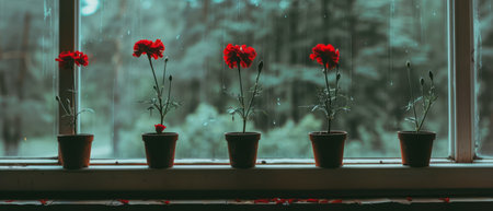 A line of bright red flowers sits neatly arranged on top of a window sill. The vibrant petals contrast beautifully against the backdrop, adding a pop of color to the scene.