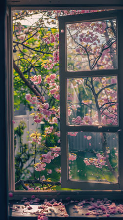 A branch of delicate pink blossoms rests on a sunlit windowsill of an old house, creating a serene scene.