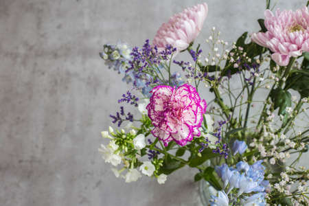 Beautiful bouquet spring pink flowers on grey cement table top view. with vase