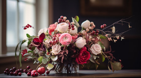 Vibrant fresh flowers arranged in a beautiful bouquet, showcasing various roses and other blooms, enhancing the ambiance with delightful colors and textures.