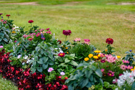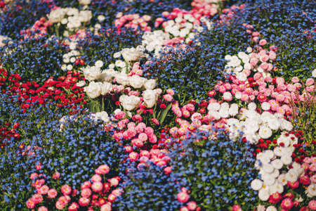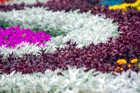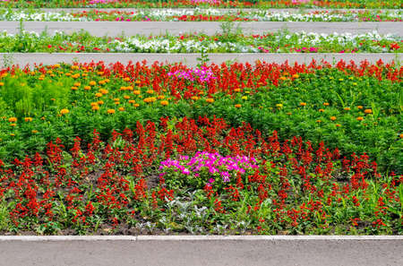 Multi-colored flower bed in the park. Outdoor summer gardening.