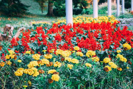 Flower bed with marigolds in an urban environment. Background with selective focus and copy space for text