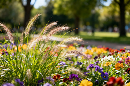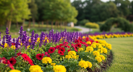 Colorful flowerbed in full bloom with blurred nature backdrop