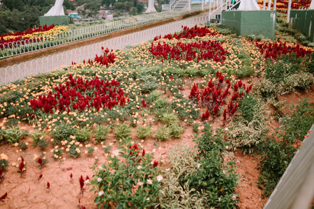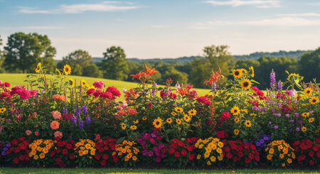 Colorful flower garden blooming with vibrant blooms under warm sunlight in the afternoon