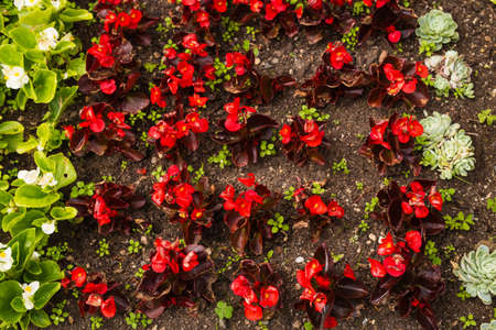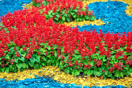 red decorative flowers on a decorated flower bed. botany and decoration of city streets