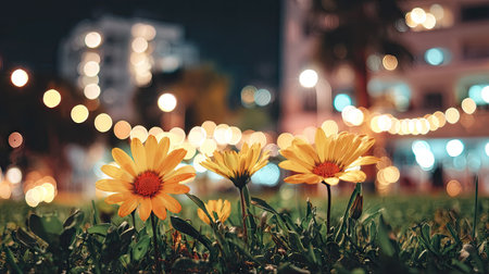 The image features vibrant yellow flowers in the foreground, with a soft focus. The background showcases blurred lights, suggesting an outdoor nighttime setting. The composition highlights natural beauty, and the image could be suitable for various commercial purposes or editorial use. The lighting provides a visually appealing aesthetic for design.
