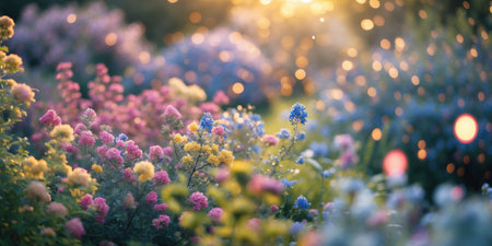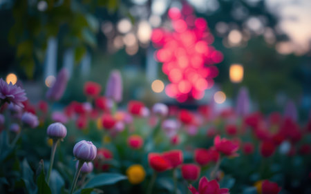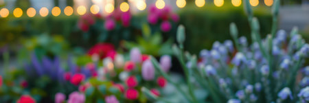 Vibrant spring garden filled with colorful flowers during dusk with soft lighting in the background