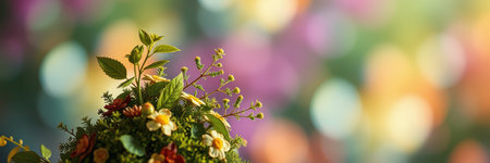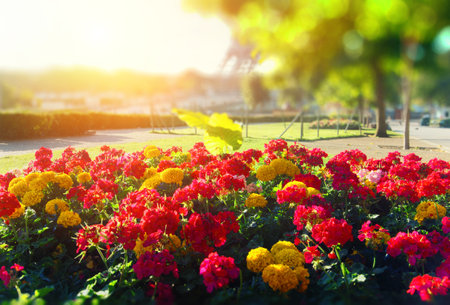 Colorful flowerbed in full bloom with blurred nature backdrop