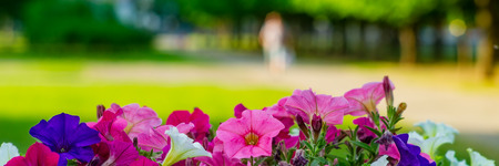 summer flowers on a blurred background of the park. Web banner.