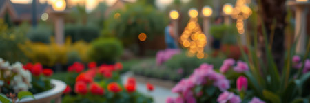 Vibrant flowers bloom in a garden during sunset with soft glowing lights in the background