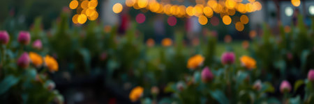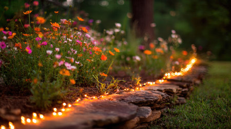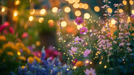 Colorful flowers bloom under twinkling lights in an outdoor garden during a summer evening celebration