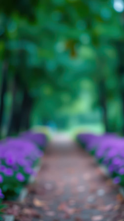Vibrant purple flowers line a blurred pathway in a serene garden environment during a sunny day in spring