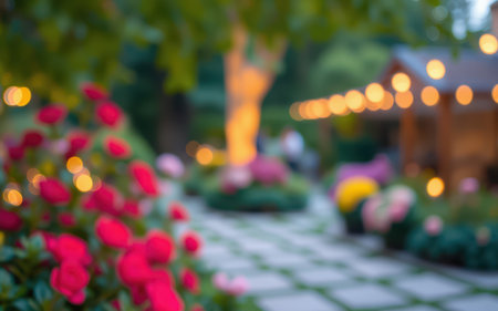 Softly lit garden at dusk with blooming flowers and decorative lights creating a serene atmosphere for evening gatherings