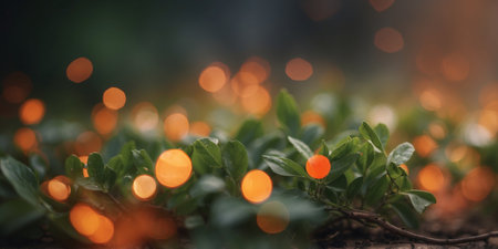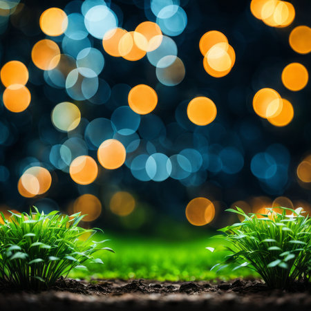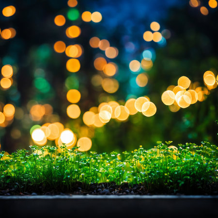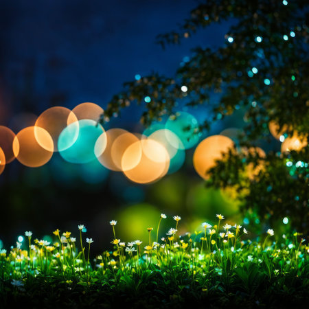 Vibrant bokeh lights and lush greenery create a serene atmosphere in a night garden setting