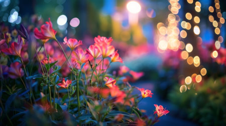 A beautiful garden scene featuring colorful flowers illuminated by soft twinkling lights, creating a serene and inviting atmosphere perfect for relaxation.