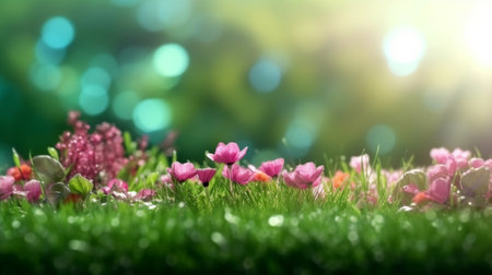 Generative AI : pink flowers on green grass background