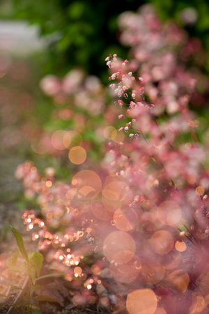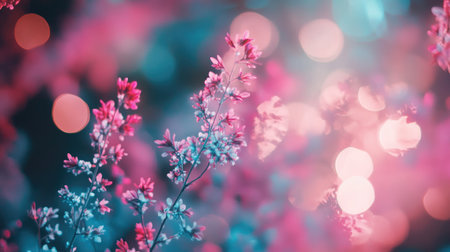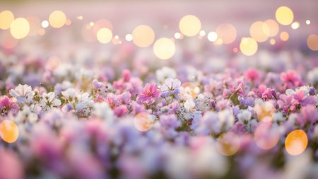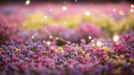 Pink showing magical bokeh lights over a dreamy field of purple and pink wildflowers in soft focus, creating an and whimsical atmosphere with delicate floral blooms...