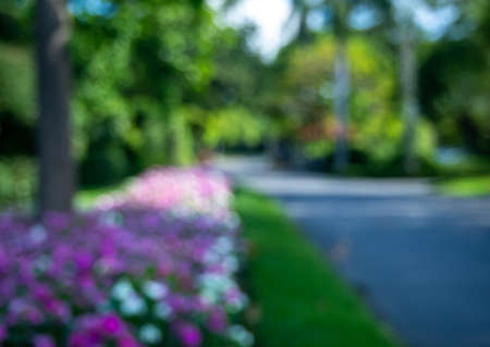 Blurry and bokeh, flowers(purple, pink, white), and jogging roads in a park with no people. eye level perspective and perspective