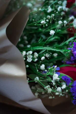 Beautiful bouquet of roses, gypsophila and other different flowers on dark background