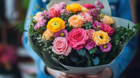 A beautiful bouquet of colorful flowers held in hand, surrounded by falling petals, symbolizing love and joy in a bright and cheerful atmosphere
