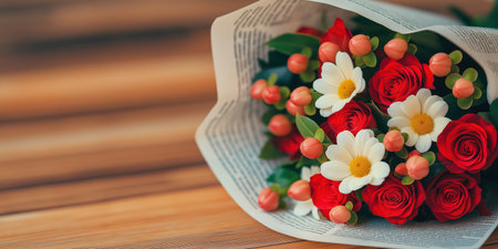 Bouquet of red roses and white daisies, wrapped in newspaper, on wood table, with copy space