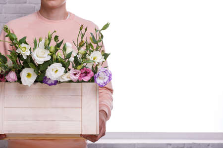 The guy in the pink sweater is holding a wooden box with Japanese roses. Front view against white window background