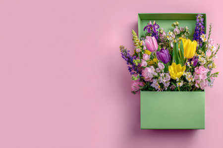 Pastel pink background with a green box overflowing with colorful spring flowers