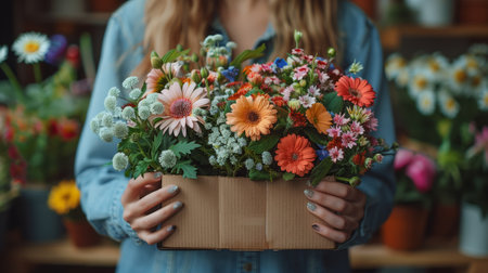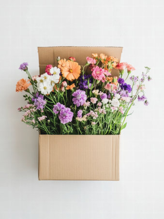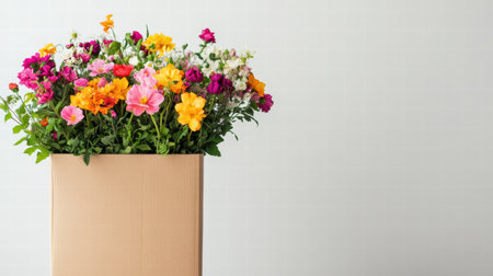 Bright and vibrant fresh flowers fill a cardboard box on a clean surface, perfect for gifting with ample space for personalization.