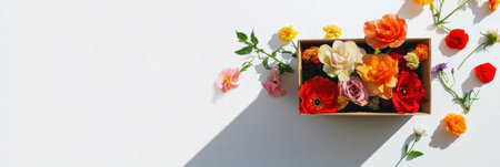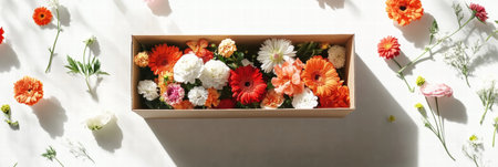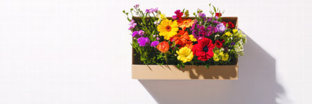 Vibrant fresh flowers are arranged in a cardboard delivery box, creating a cheerful focal point with room for additional text or design elements.