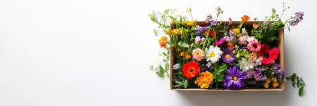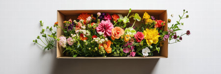 Cardboard delivery box filled with colorful fresh flowers, ideal for promotional designs or floral arrangements with ample blank space.