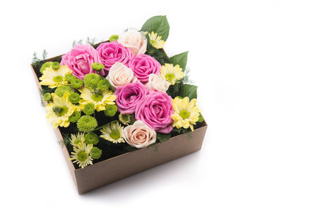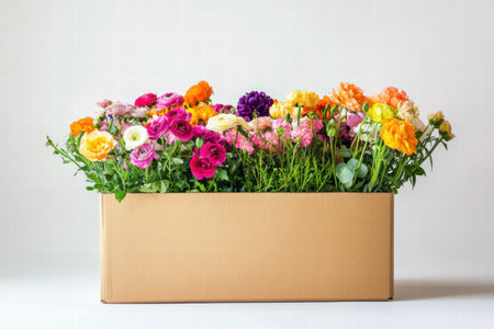Colorful fresh flowers arranged in a cardboard delivery box on a clean surface, perfect for displays and text placements.