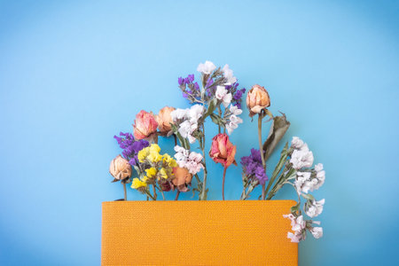 dry flowers (white, purple, yellow, white roses) sticking out of a notebook on a blue background with a place for a signature