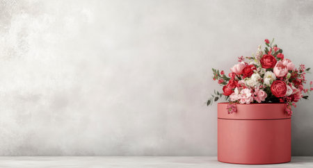 A cardboard box brimming with colorful, fresh flowers sits against a light backdrop, offering space for messages or branding.