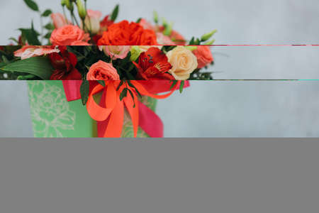 Red bouquet of rose, alstroemeria and eustoma in a green paper gift box on a gray background.