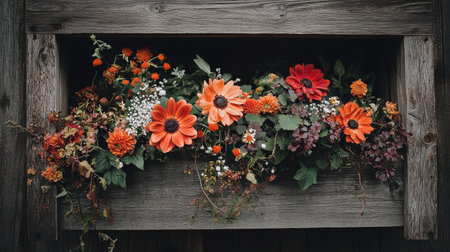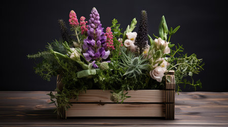 A stunning flower arrangement bursts with color and texture, set in a rustic wooden planter. This vibrant display captures the beauty of nature in a serene atmosphere.