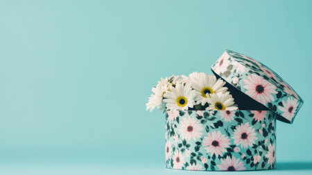 A charming floral gift box adorned with daisy flowers sits against a soft pastel blue background, perfect for celebrations and vibrant gifting moments.