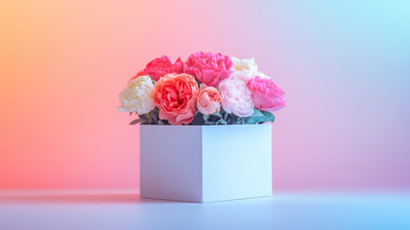This image showcases a stunning arrangement of colorful artificial flowers in a white square box, set against a soft pastel background. Ideal for decorative inspiration.