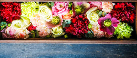 beautiful colorful flowers in wooden basket professional advertising food photography