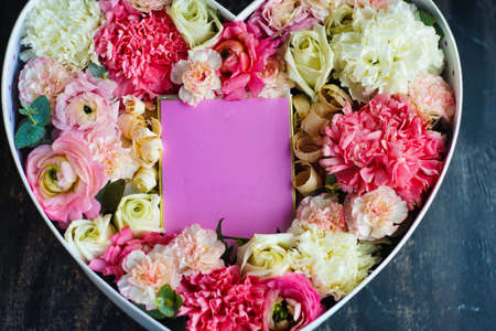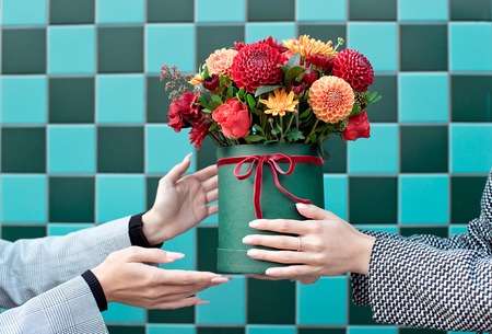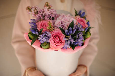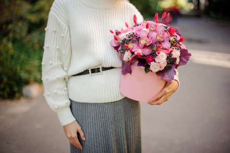 Close-up flower-box in woman hands as a gift concept for wedding, birthday, event, celebration, flowers delivery, surprise