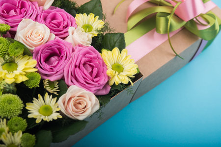 Colorful fresh flowers arranged in a cardboard delivery box on a clean surface, offering ample space for branding or messaging.