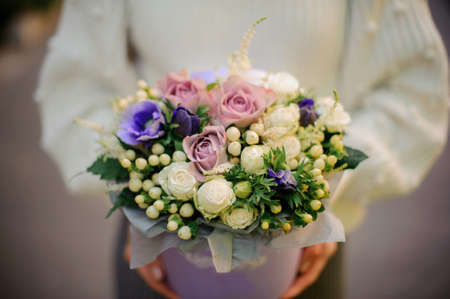 Woman in the white sweather holding in her hands a box of tender white, blue and violet flowers