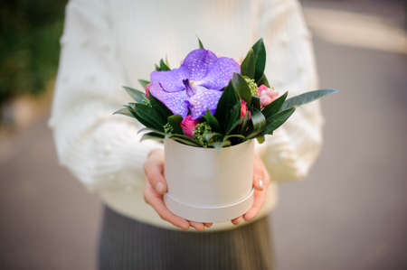 Woman in the white sweather holding in her hands a white box of violet orchid decorated with little pink roses and green leaves