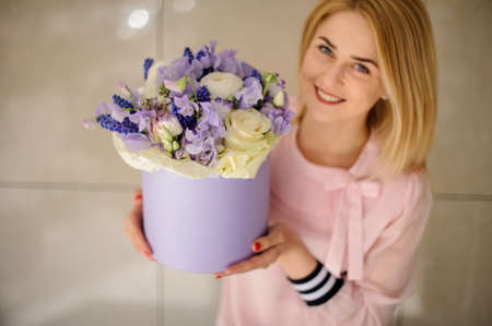 Young blond woman in pink blouse holding a beautiful flower composition in green round box and looks at it.