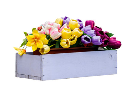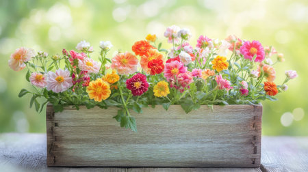 A beautiful and colorful flower arrangement in a rustic wooden planter, set against a soft natural background with a lovely bokeh effect. Ideal for decor.
