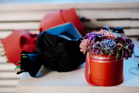 Beautiful floral arrangement in hat box. Carnation, calla, astrantia, lavender