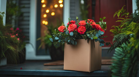 A rose bouquet delivery box with eco-friendly branding, placed on a doorstep in a cozy neighborhood