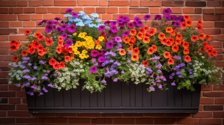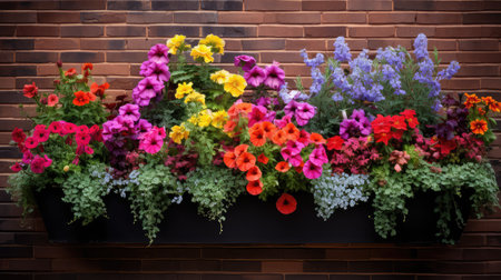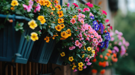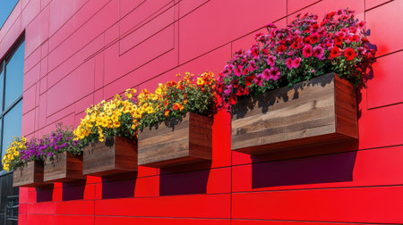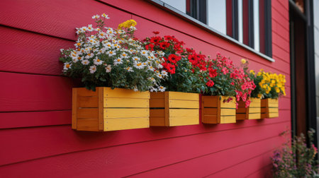 A stunning display of colorful flower boxes hanging on a bright red wall, showcasing vibrant blooms that enhance the charm of the outdoor space.