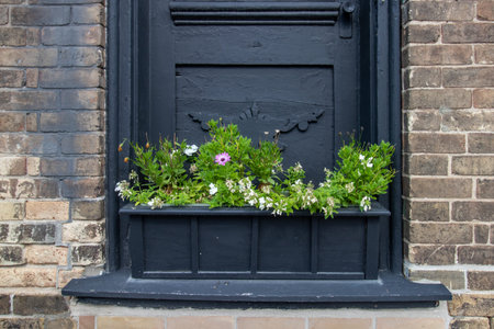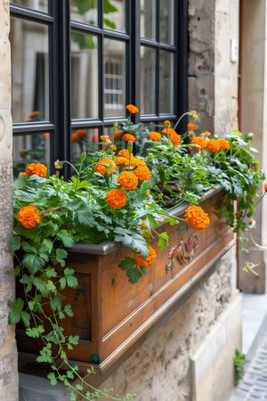 Orange marigold flowers are growing in a wooden flower box under a window, adding a touch of color to the building's facade